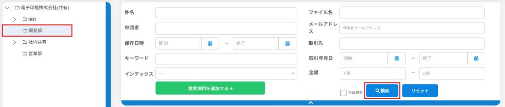 ・[検索項目を追加する+]で長期保存文書に登録したインデックスの内容で検索ができます。
