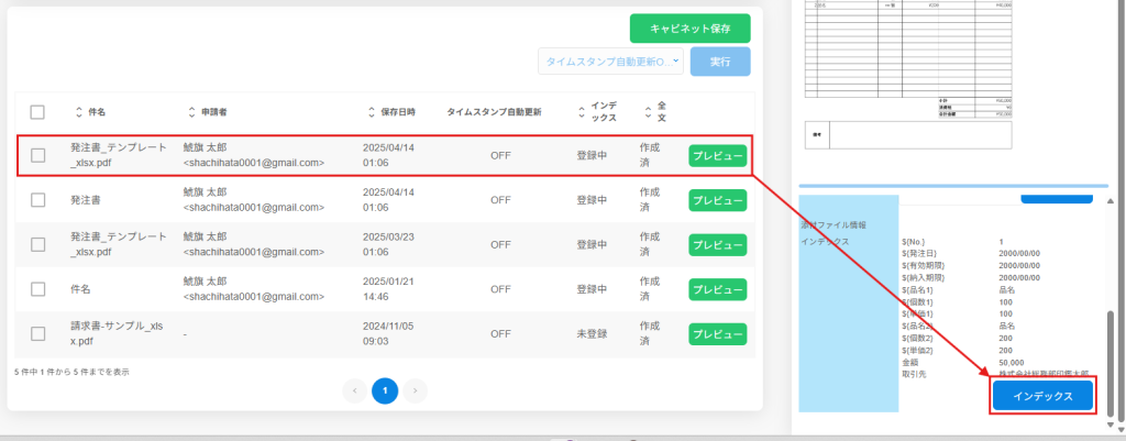 2.インデックスを登録・更新したい文書の[プレビュー]をクリックします。