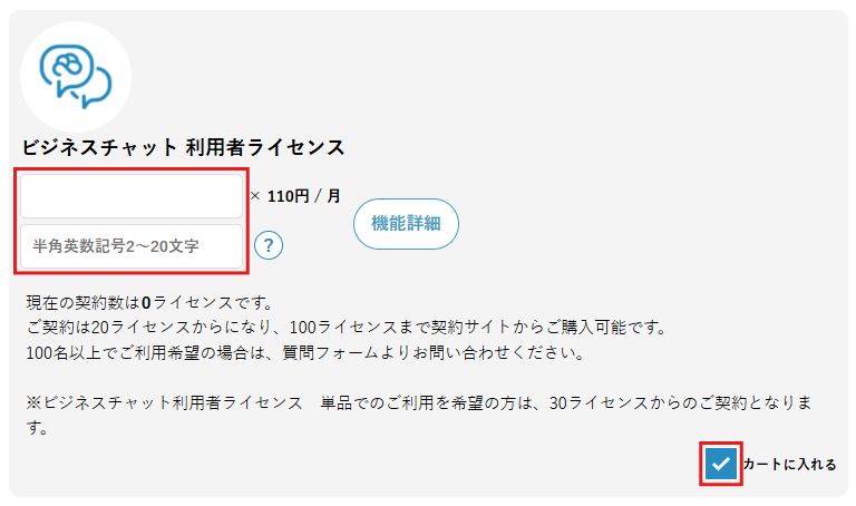 3.ビジネスチャットのご利用人数とご希望のサブドメインを入力して[カートに入れる]にチェックを入れます。