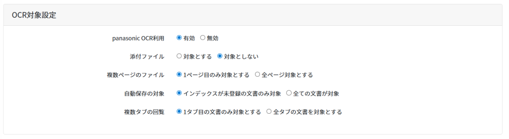 インデックスのステータスが「登録済」または「登録中」の文書を、自動保存時のOCR対象とするかを選択できます。