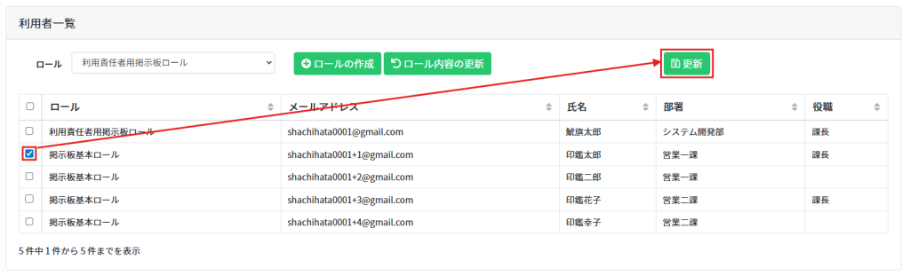 3.ロールを割り当てたい利用者にチェックを入れ、[更新]をクリックします。