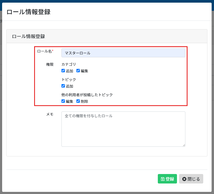 ロールを作成し、利用者に割り当てることで、掲示板の利用権限を柔軟に管理できます。