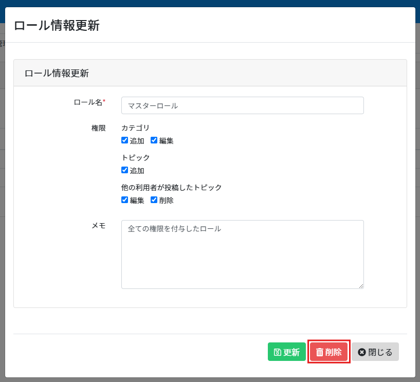 「掲示板基本ロール」および利用者に割り当てているロールは削除できません。