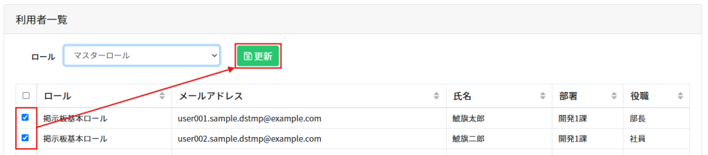 4.ロールを割り当てる利用者にチェックを入れ、[更新]をクリックします。