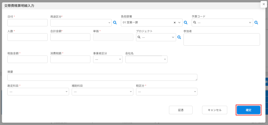 | 予算コード | 経費に関する予算コードを選択します。 ヘッダー部で設定した予算コードが初期値として設定されます。 |