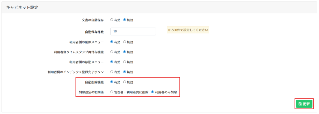 2.「自動削除機能」を有効にし、削除設定の初期値を設定後、[更新]をクリックします。