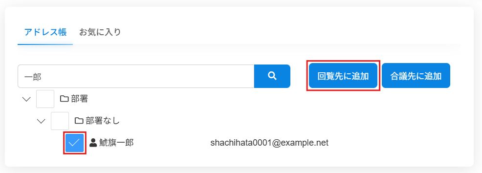 2.[アドレス帳]を開き、追加したいユーザーにチェックを入れ、[回覧先に追加]をクリックします。