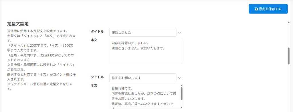 回覧の申請・承認時、ファイルメール便の送信時、またアンケート送信時などに使用するメッセージの定型文は、あらかじめ設定しておくことが可能です。