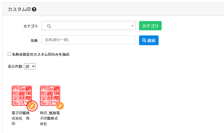 名称未設定のカスタム印のみ検索する場合は、「名称未設定のカスタム印のみを抽出」 にチェックを入れて[検索]をクリックしてください。
