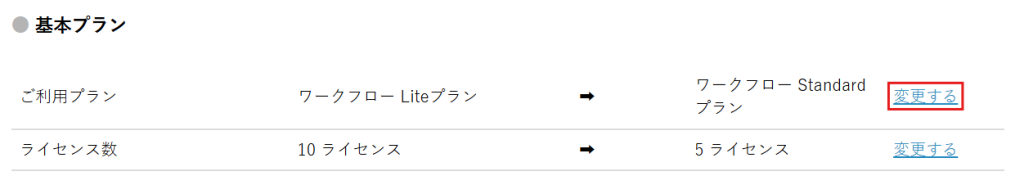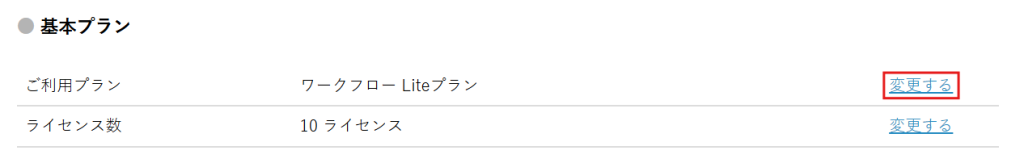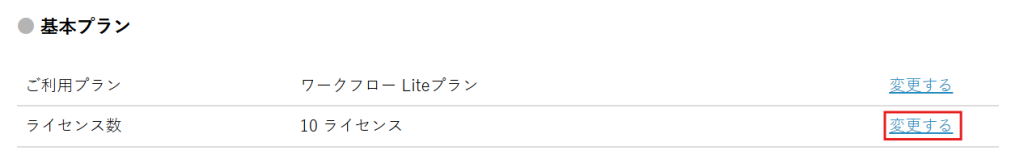2.基本プランにて、「ライセンス数」の[変更する]をクリックします。