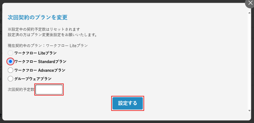3.変更したいプランを選択し、次回更新予定の契約数を入力し、[設定する]をクリックします。