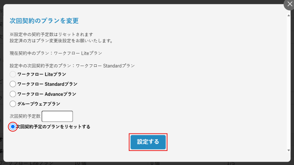 3.「次回契約予定のプランをリセットする」を選択し、[設定する]をクリックします。