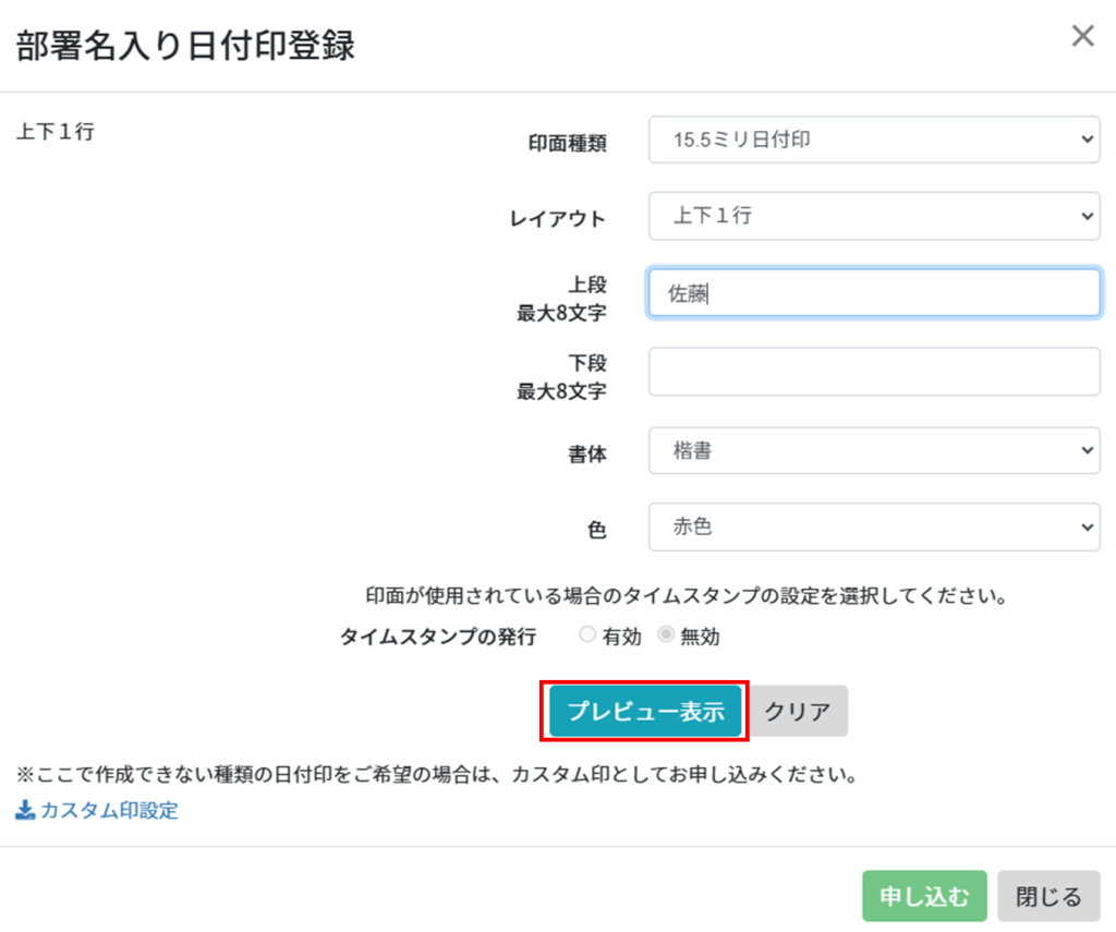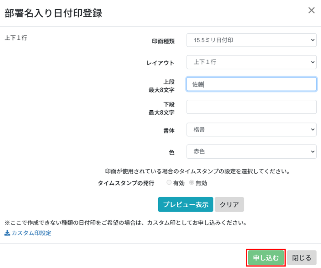 3.登録済印面(セレクト印・カスタム印)の[カスタム印]をクリックします。