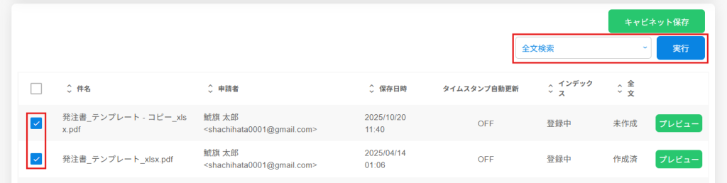 2.全文検索対象にしたい文書にチェックを入れ、プルダウンから「全文検索」を選択し、[実行]をクリックします。