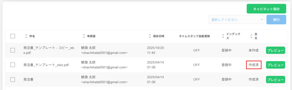 3.文書のステータスが「作成中」から「作成済」に変わると、全文検索の対象として登録が完了します。