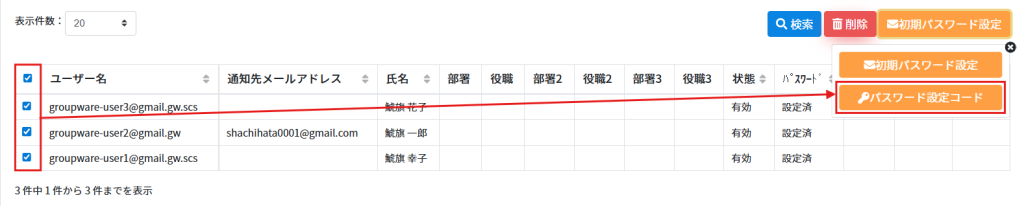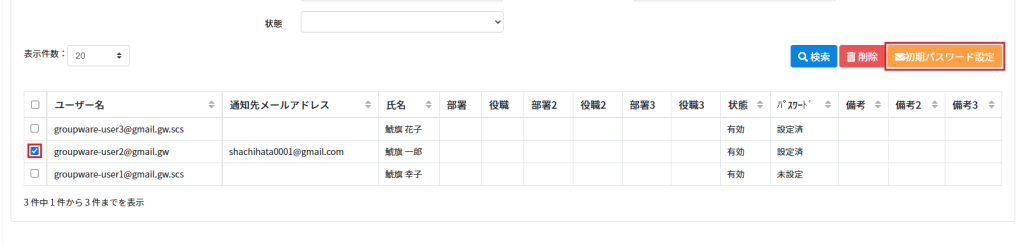 一括で送信する場合は、グループウェア専用利用者一覧から該当の利用者にチェックを入れ、[初期パスワード設定]をクリックします。