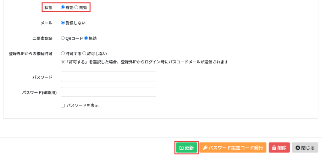9.状態を「有効」に変更し、[更新]をクリックします。