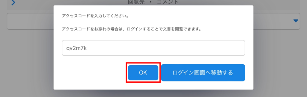 タップ後回覧文書の設定によっては、アクセスコードの入力を求められることがあります。アクセスコードを求められた場合は、承認依頼メールの後に届く「アクセスコードのお知らせ」メールに記載のアクセスコードを入力し、[OK]をタップします。