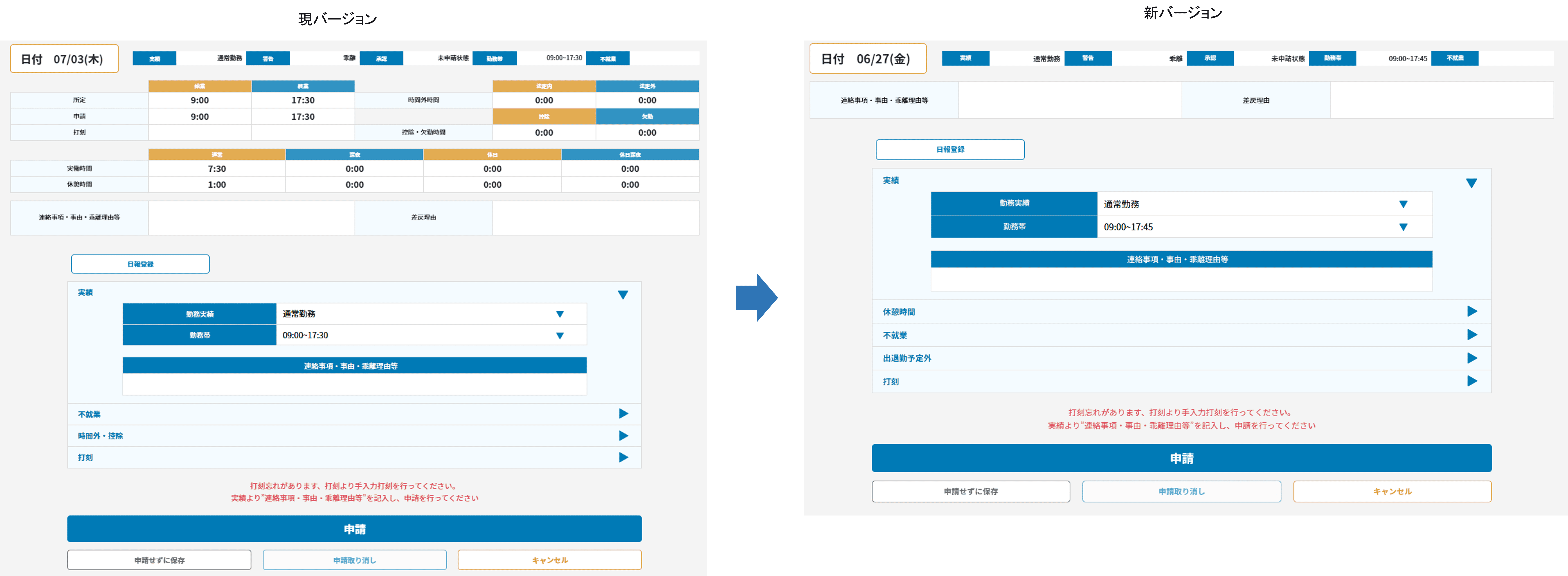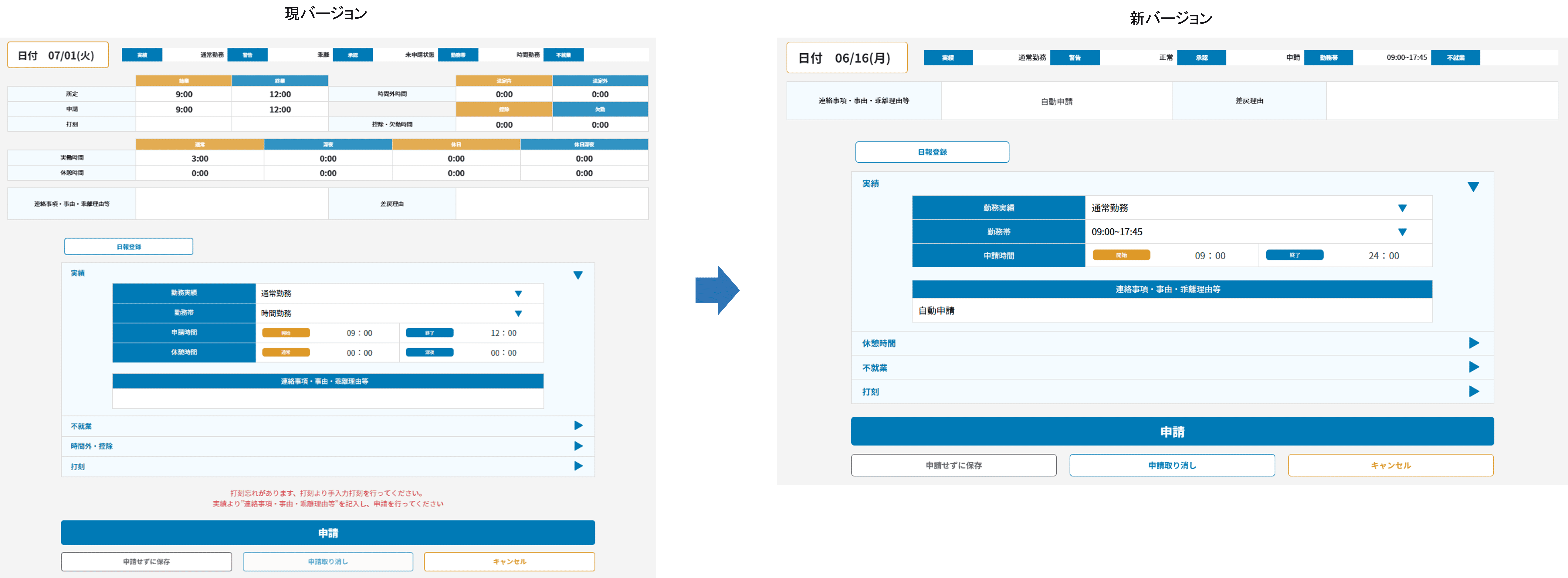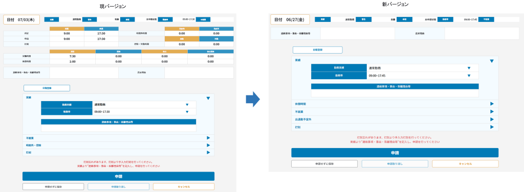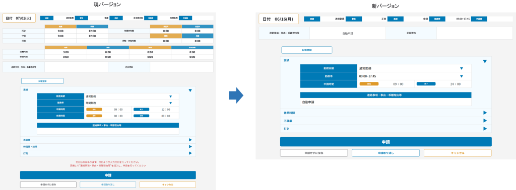 本人入力>出勤簿の申請画面のバージョン比較になります。