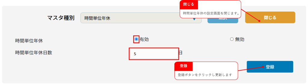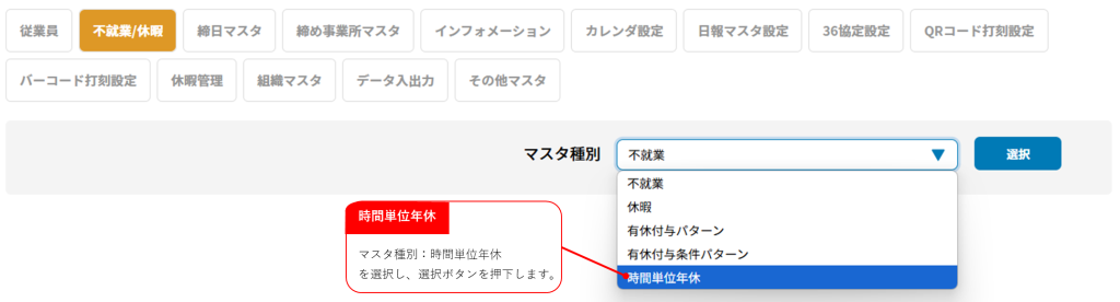 設定>不就業/休暇>マスタ種別:時間単位年休では時間単位年休を取得可能にするための事前設定します。
