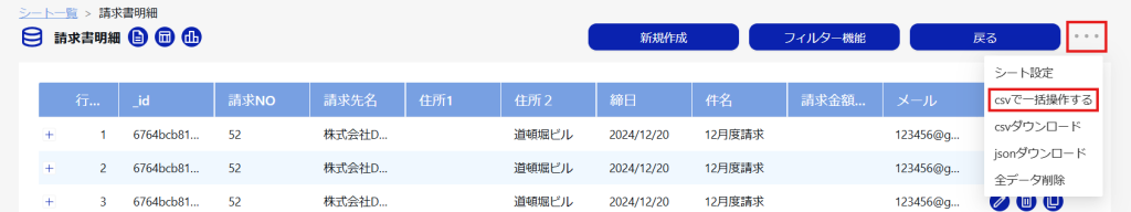 3.[…]メニューから[CSVで一括操作する]を選択します。