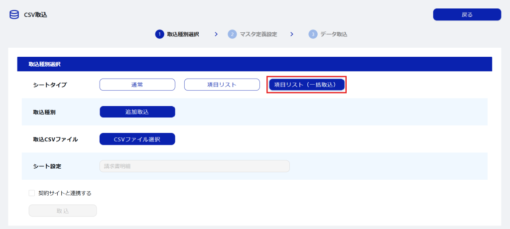 4.シートタイプを[項目リスト(一括取込)]に設定します。