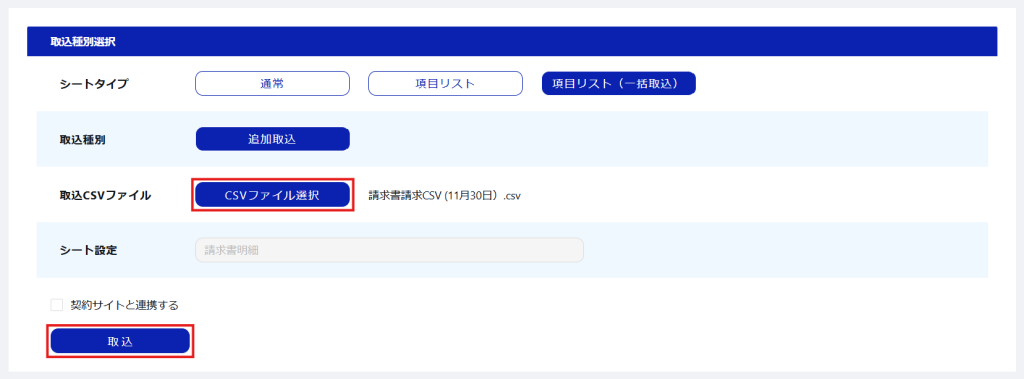 5.[CSVファイル選択]をクリックして「1.請求データの作成」で作成したCSVファイルを選び、[取込]をクリックします。