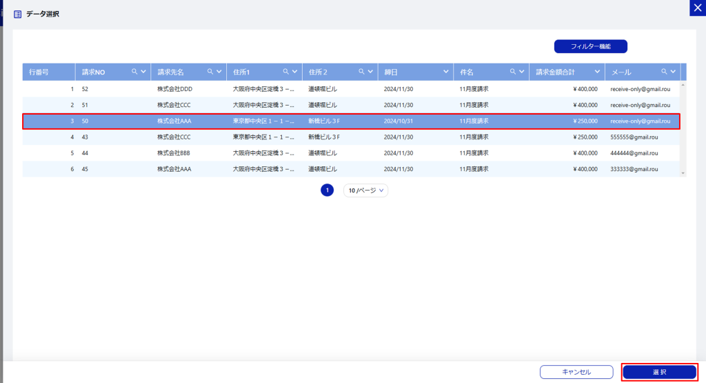 帳票名や締日、請求先名など条件を指定して検索ができます。