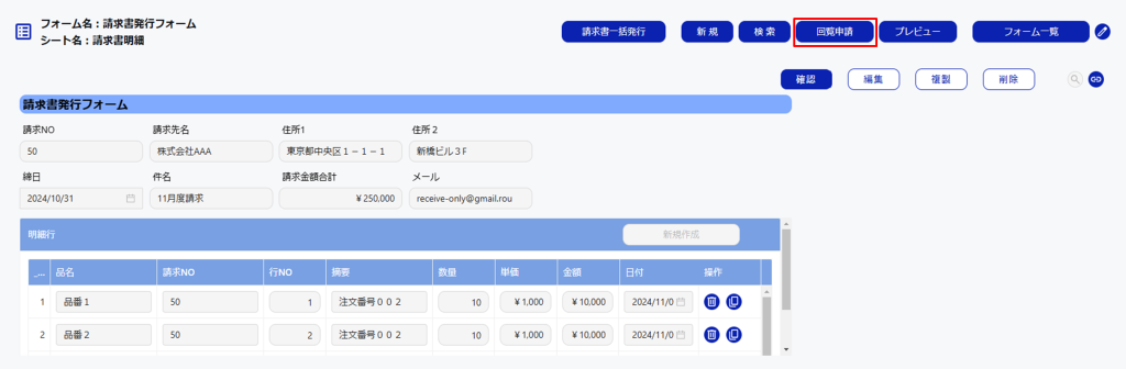 | 1 | プレビュー | アイコンをクリックすると請求書のプレビューが表示されます。 |