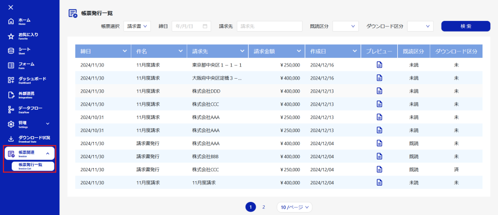 帳票発行一覧にて発行済みの請求書が確認できます。