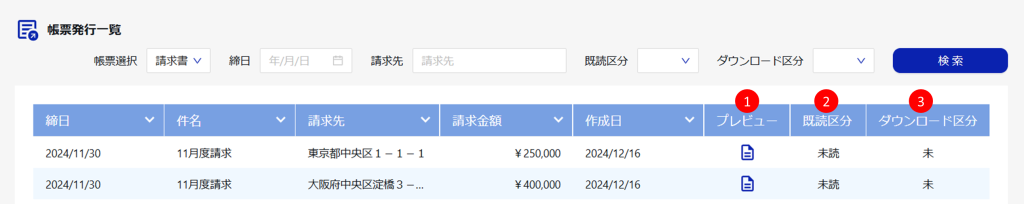 | 2 | 既読区分 | 請求先での閲覧状況(未読/既読/失敗)を確認できます。 |