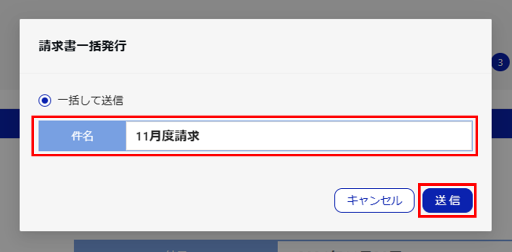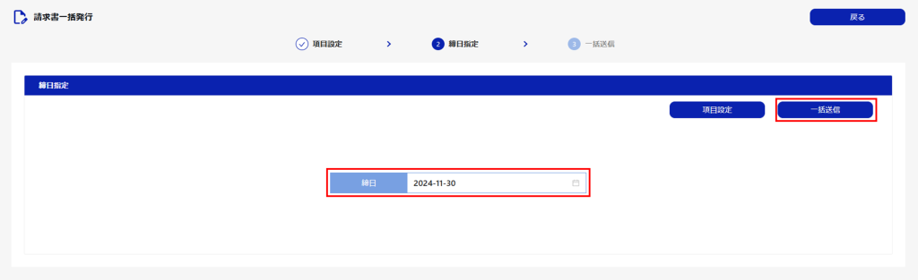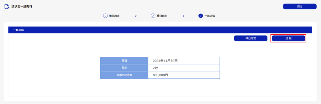3.一括発行する請求書の「締日」を選択し、[一括送信]をクリックします。