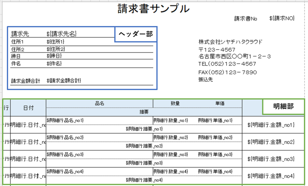 明細数やヘッダー部・明細部の各項目は、企業の請求書テンプレートに合わせて設定します。