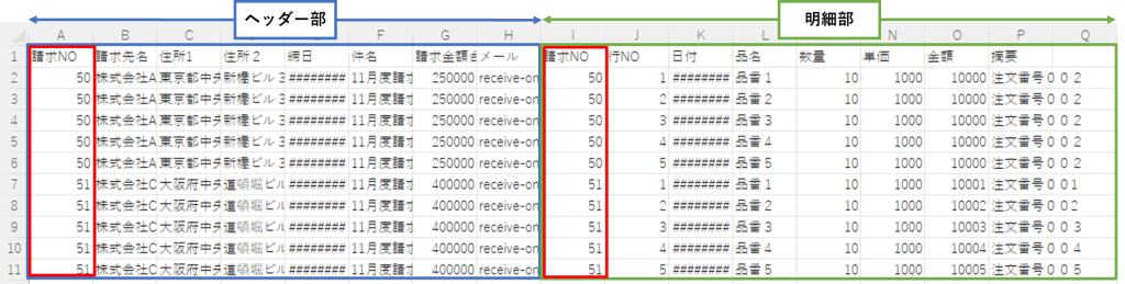 請求データCSVサンプル画像の赤枠(例:「請求NO」)のように、ヘッダー部と明細部の最初の項目には必ず「キー項目」を記載します。