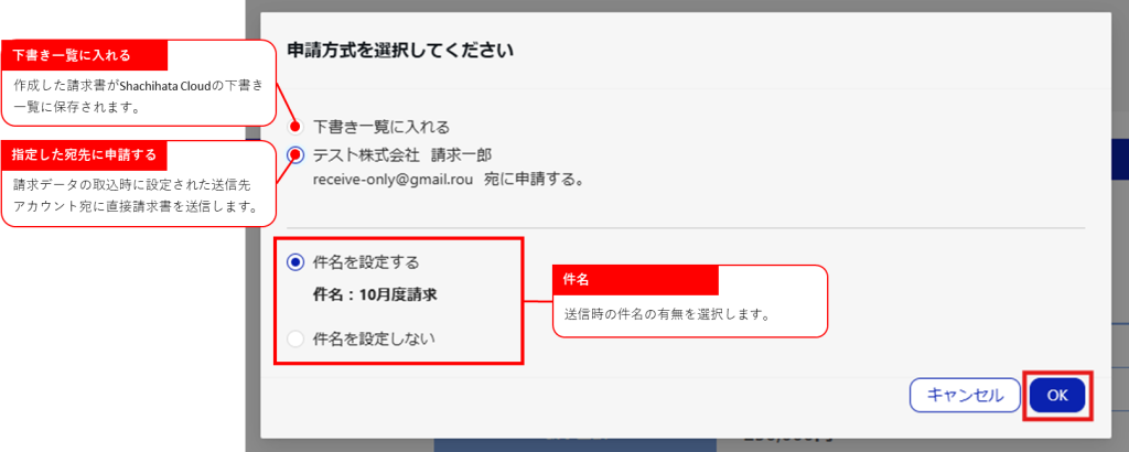 7.申請方法と件名の有無を設定し、[OK]をクリックます。
