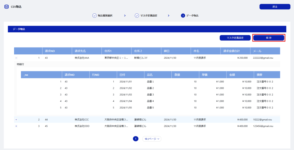 6.プレビュー画面で取込内容を確認し、問題がなければ[保存]をクリックします。