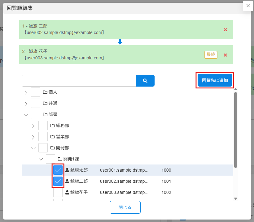 追加したいユーザーにチェックを入れ、[回覧先に追加]または[合議先に追加]をクリックします。