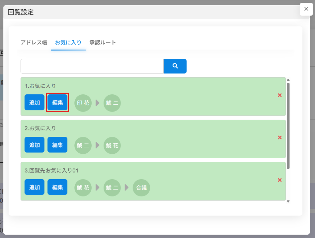 お気に入りに登録済みの回覧ルートの編集(回覧先の追加・削除・回覧順の変更)ができます。