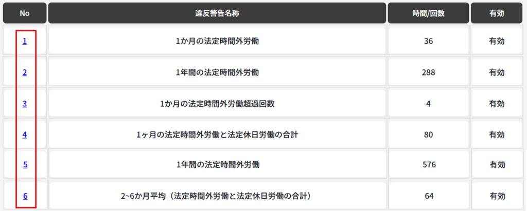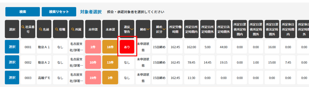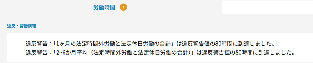 違反警告が発生している場合下記の箇所で確認できます。本人入力>労働・休暇状態確認の[違反・警告情報]