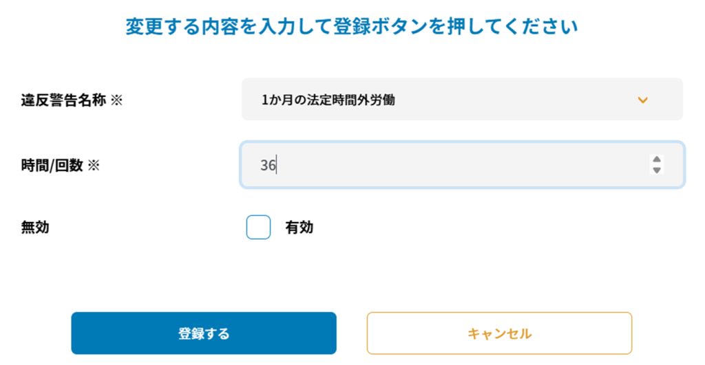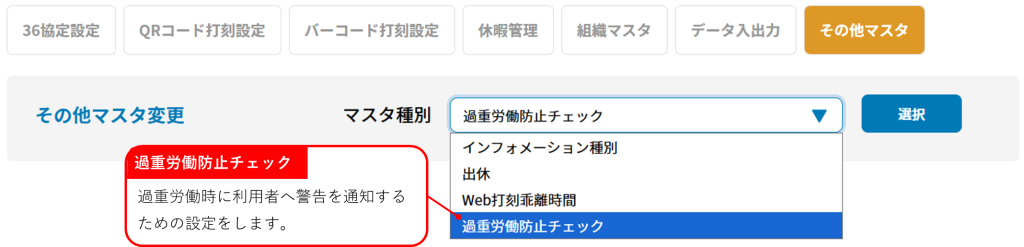 設定>その他マスタのマスタ種別:過重労働防止チェックより過重労働時に利用者へ警告を通知するための設定をします。