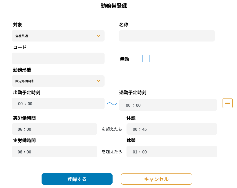 実労働時間 | 設定した労働時間を超えた場合の休憩時間を設定します。 例)労働時間6時間 休憩時間00:45 |