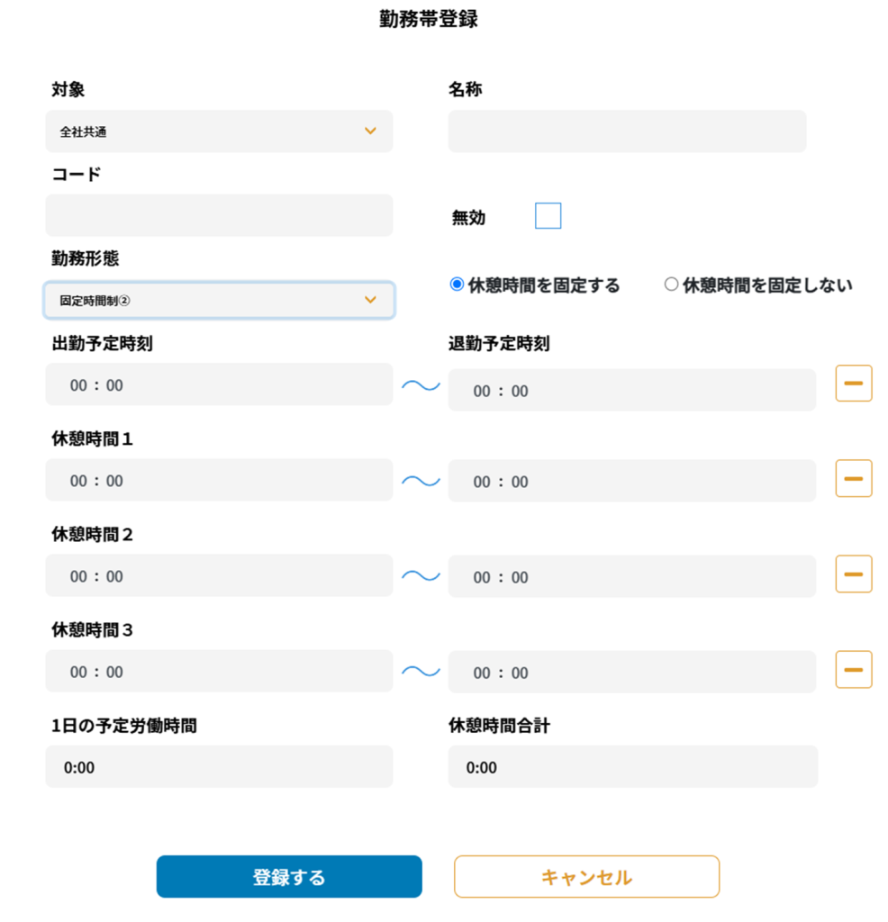 実労働時間 | 設定した労働時間を超えた場合の休憩時間を設定します。 例)労働時間8時間 休憩時間00:60 |