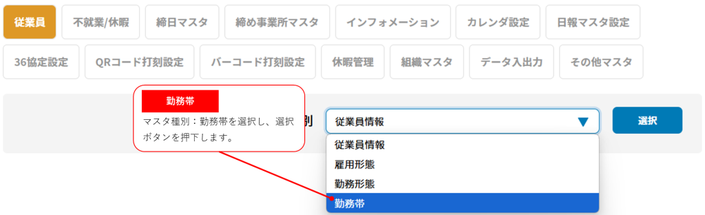 設定>従業員>マスタ種別:勤務帯では、変形労働などの働き方に関する設定します。