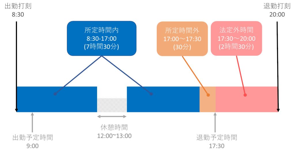 ・退勤予定時刻より後の労働で、法定時間外にあたらない労働を「所定外」または「深夜所定外」に計上します。