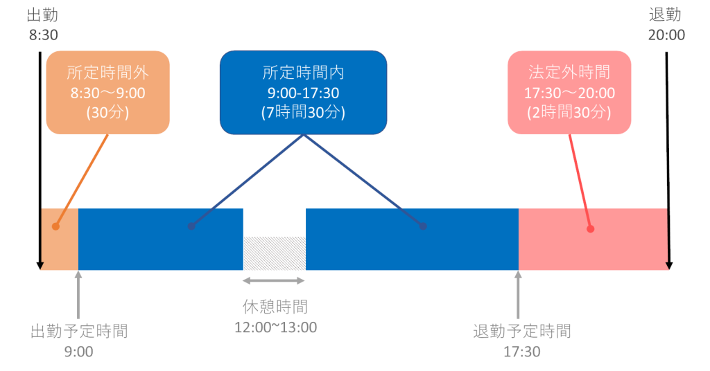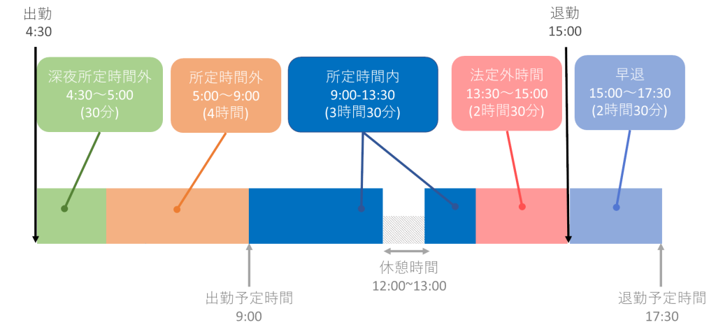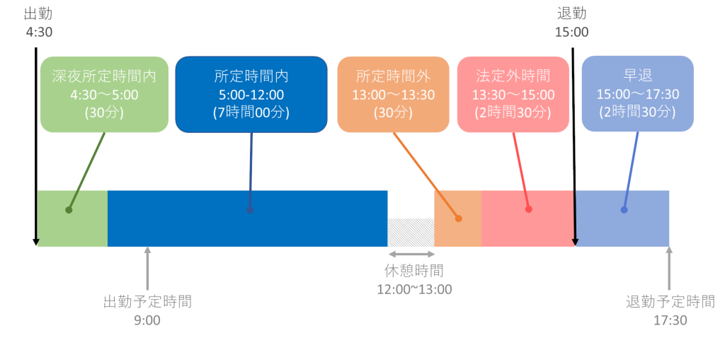 ・出勤予定時刻より前に出勤した場合、その分を「所定外」または「深夜所定外」に計上します。