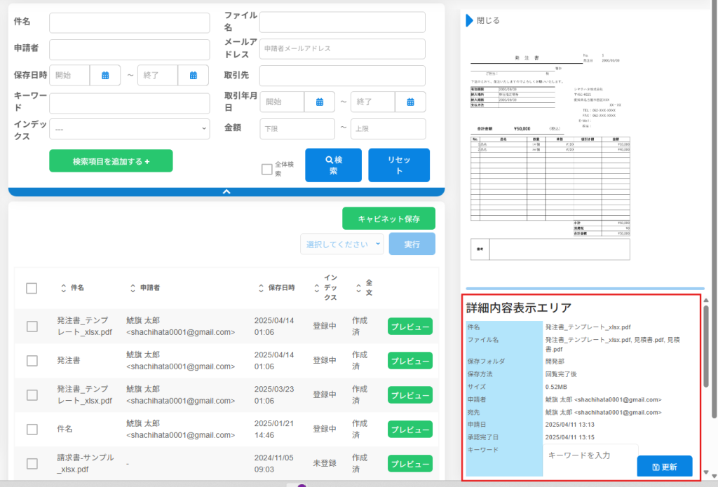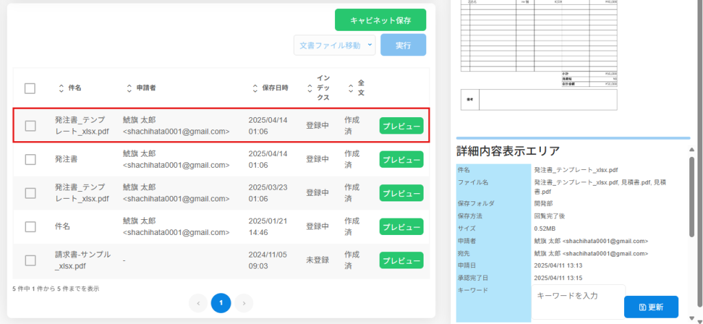 3.文書上をクリックすると詳細内容表示エリアが表示され文書情報の確認ができます。