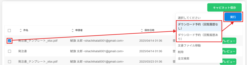 1.ダウンロードしたい文書にチェックを入れ、プルダウンより「ダウンロード予約」を選択し[実行]をクリックします。