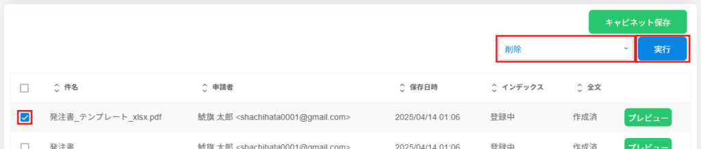 1.削除したい文書にチェックを入れ、プルダウンより[削除]を選択し[実行]をクリックします。