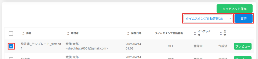 1.タイムスタンプの自動更新をONにしたい文書にチェックを入れ、プルダウンより[タイムスタンプ自動更新ON]を選択し[実行]ボタンをクリックします。
