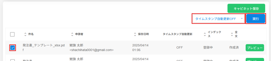 2.タイムスタンプの自動更新をOFFにする場合は、文書にチェックを入れ、プルダウンより[タイムスタンプ自動更新OFF]を選択し[実行]ボタンをクリックします。